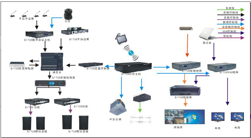终端、液晶显示器),这几样设备的组合应用也可以说是一个会议系统了,它们起到了传声,显示,扩声的作用,达到能看、能听、能说话。
