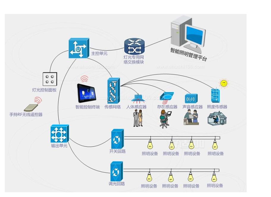 本系统由系统单元、输入单元与输出单元。系统单元:用于提供工作电源,源系统时钟及各种系统的接口如 PC、以太网、电话等;输入单元:主要功能是将外部控制信号换成网络上的传输信号,具体有开关,红外接收开关,红外遥控器,多功能的控制板,传感器;输出单元:智能系统的输出单元是用于接收来自网络传输的信号,控制相应回路的输出以实现实时控制。